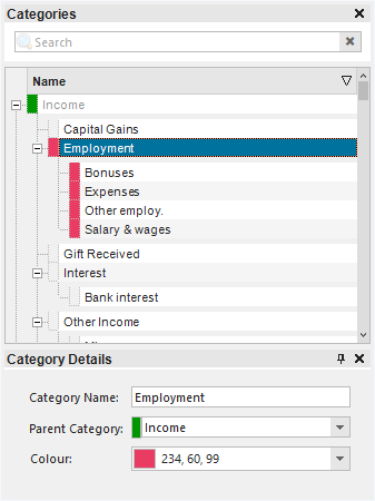 Each category can be assigned a colour. This colour will then be displayed in dropdown lists, charts and in the calendar.