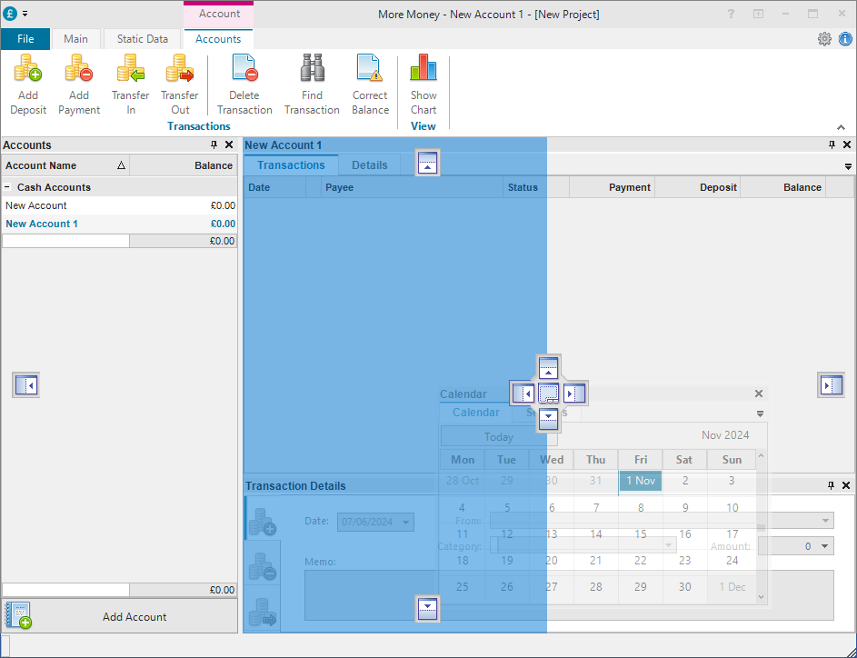 The layout of windows within Maxim Money is completely flexible, allowing you to view multiple windows simultaneously, for example, different account transaction registers side-by-side, with charts, calendar and portfolios arranged around them.