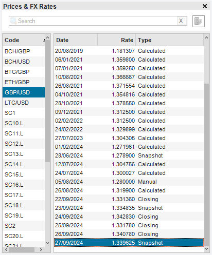 The Prices & FX Rates view allows you to see all the securities and currency pairs that Maxim Money has a price for.