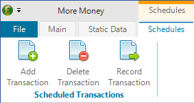 There are two ways to create scheduled transactions. You can either to into the Scheduled Transaction screen, which will activate the Scheduled Transactions context menu, and click Add Transaction.