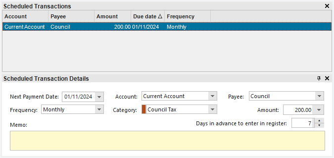 Scheduled Transactions are pre-defined transactions that will be automatically entered into your register at the frequency you require. The most common use for this is to enter any direct debits you have on your account, so you can see the effect the transaction will have on your account balance before it actually comes off, helping you to predict your future balance.