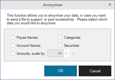 Maxim Money also has an anonymiser feature. This changes any sensitive information in your data file, allowing you to post screenshots or send data files to support. To activate this, select the Info icon